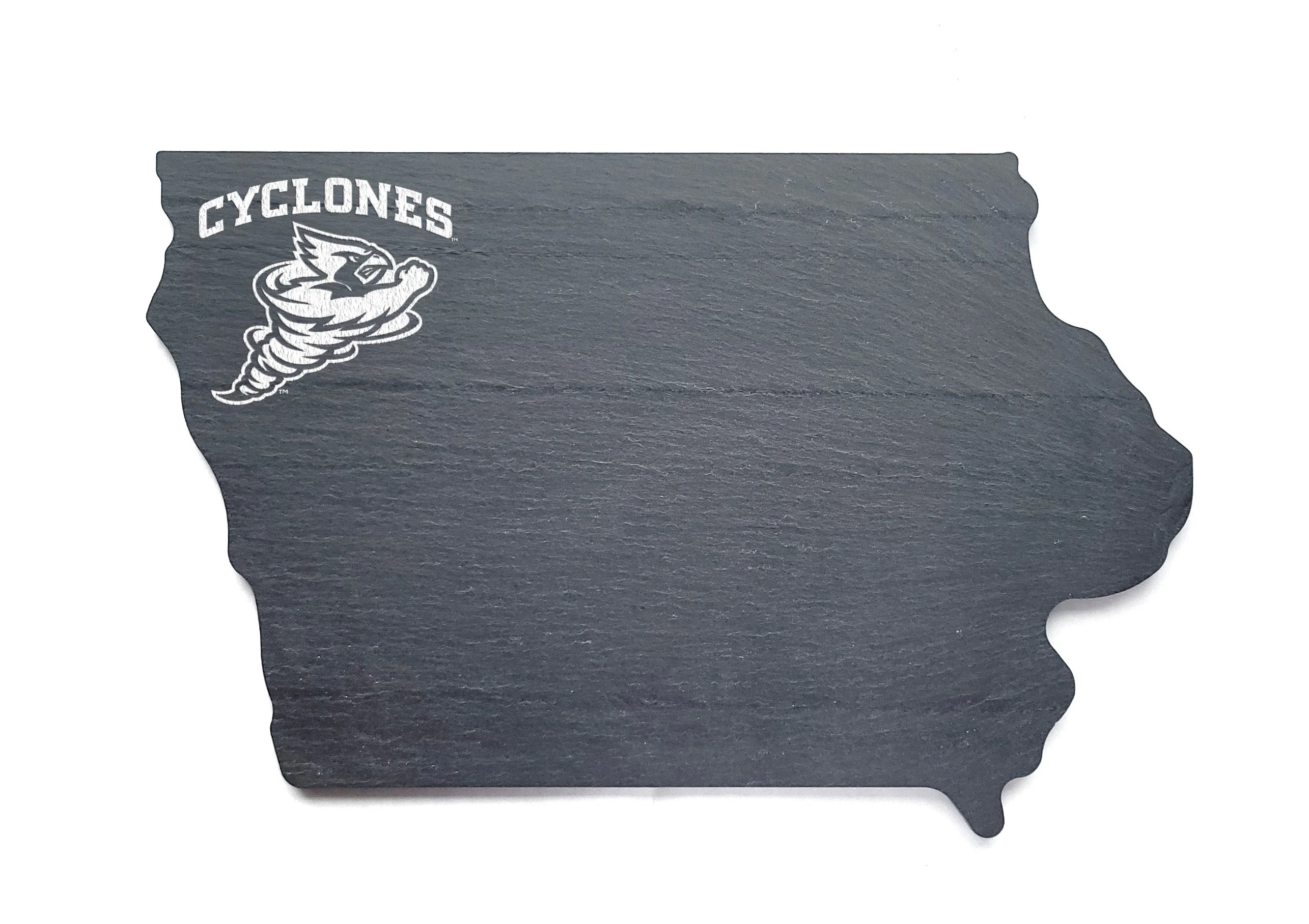 The Iowa State Cyclones Cynado on a beautiful natural black or red slate Iowa shaped cheese board! This is cut in-house by Cheers Ink and is such a unique way to enjoy charcuterie! These are perfect for date night, birthday celebration, housewarming or Christmas gift! This is an Officially Licensed Iowa State University product.