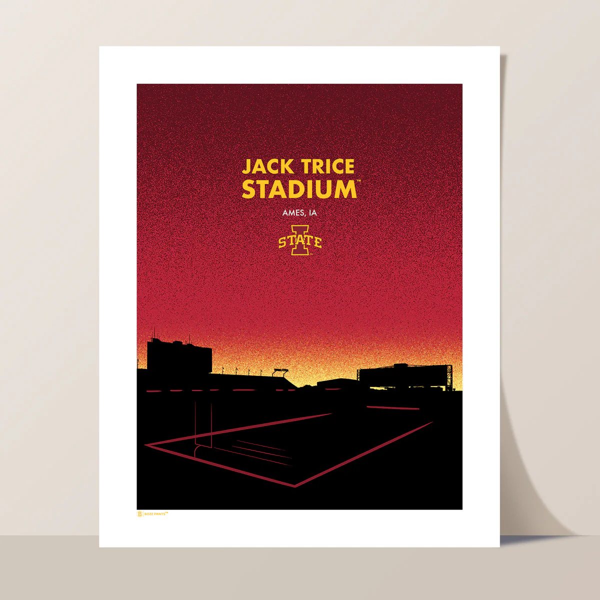 The silhouette of the iconic Jack Trice Stadium set against a dramatic, sunlit backdrop. It’s the perfect print for any Cyclone football fan.Â