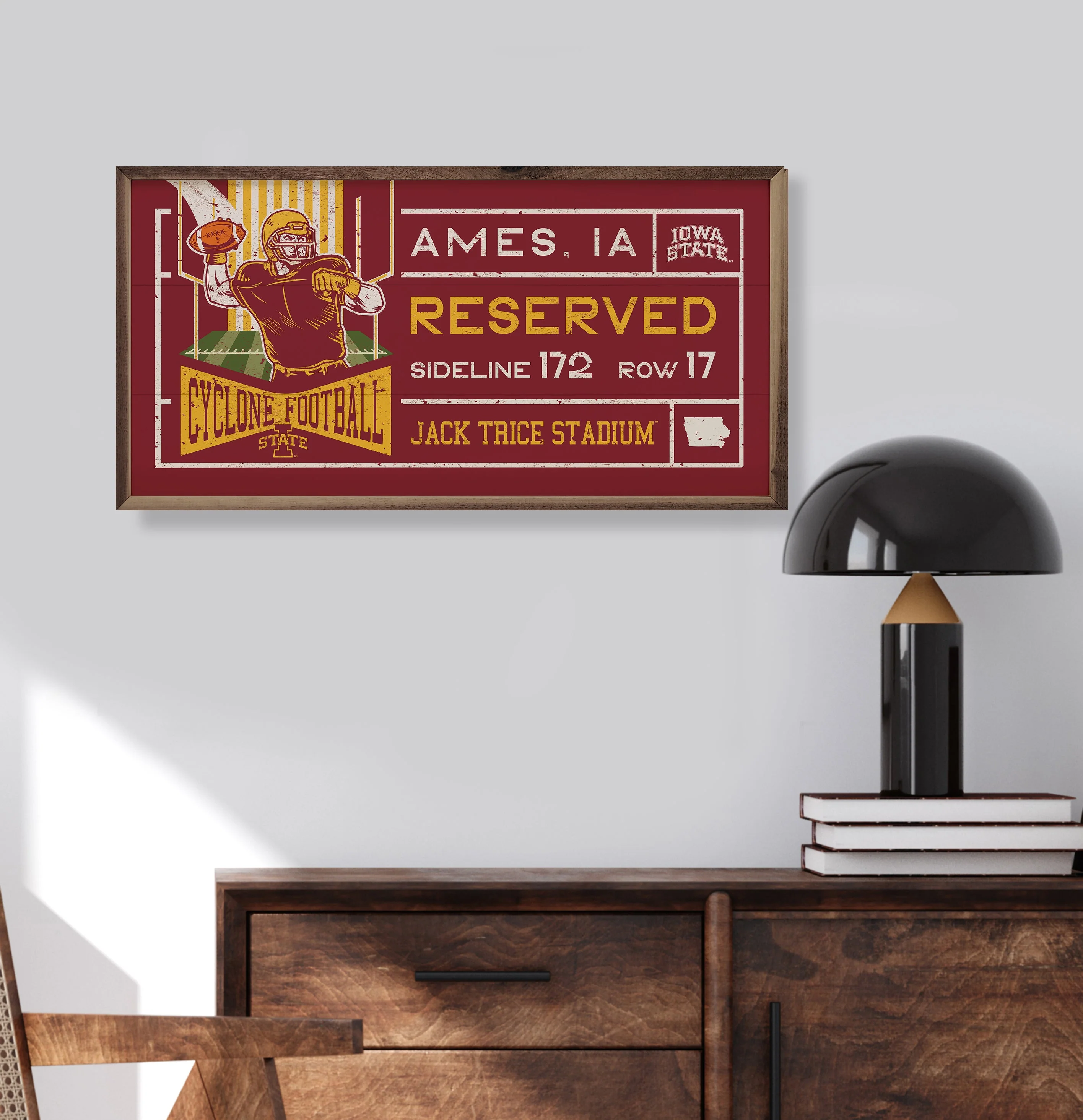 Kendrick Stadium officially licensed collegiate signs have designs to fit into any home style and are the perfect way to show off school spirit. Made of high-quality American hardwood planks with a hand painted face, printed with UV cured ink, and framed in a natural walnut frame. Easy to clean with a dry cloth.